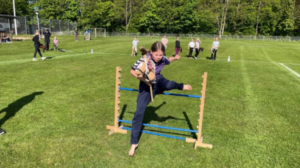 Fuld galop på Vellev Stadion, hvor en flok piger hver anden uge går til kæphesteridning i